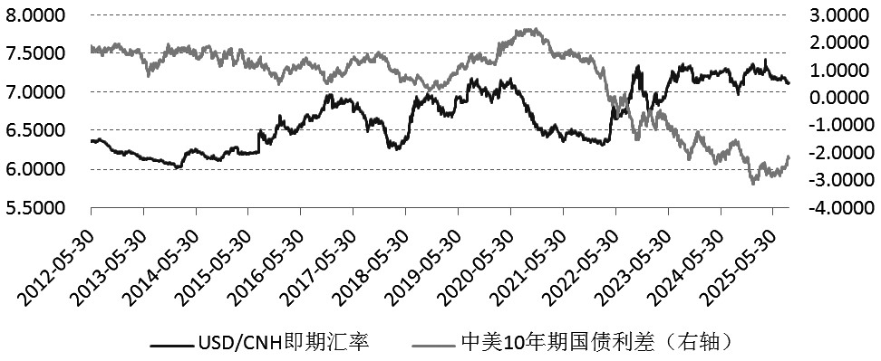 圖為美中國債利差和人民幣匯率走勢對比(單位:%)